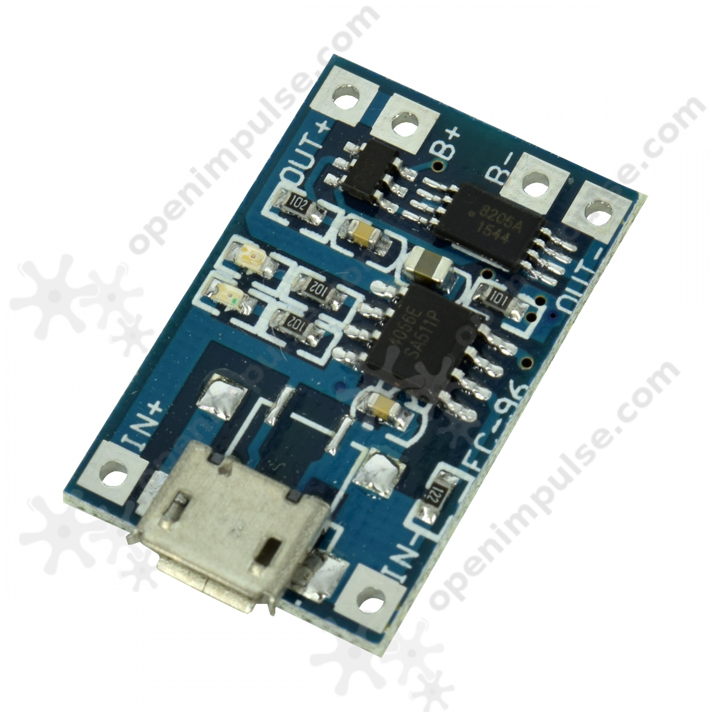 OverviewThis is a micro USB Li Po battery charger module that uses TP4056 integrated circuit with 1 A charging current. It uses a micro USB for connecting the board to computer and works with linear charging. This module can be used to charge single cell battery and it has the ability to protect your lithium battery from overcharging. Specifications